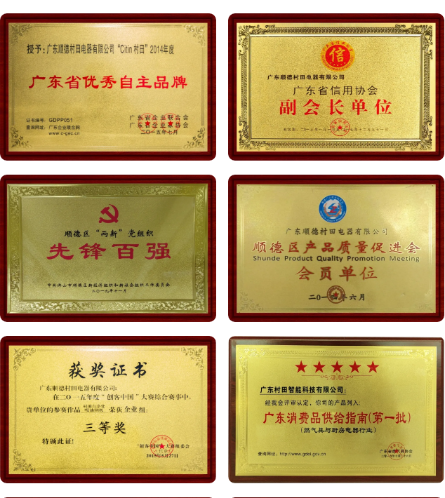 公司通过了“九游平台电工产品认证委员会(CCEE)认证”、荣获九游平台吸油烟机“高效净化环保之星”、“欧盟推荐产品”、“广东省高新技术产品”证书、“荣获燃气具生产许可证”、“九游平台五金制品协会吸油烟机分会理事单位”、“广东省信用协会副会长单位”、“广东燃气具协会副会长单位”、“广东顺德中小企业促进会副会长单位”、“2014
