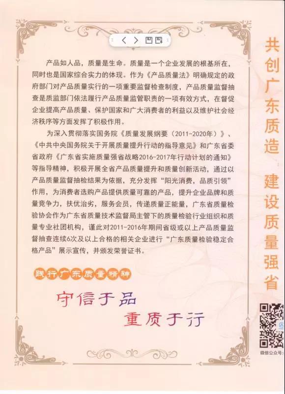 据悉,为贯彻落实国务院《质量发展纲要(2011-2020年)》、《中共中央国务院关于开展质量提升行动的指导意见》和广东省委省政府《广东省实施质量强省战略2016-2017年行动计划的通知》等指导精神,积极开展全省产品质量提升和质量创新活动,通过以产品质量监督抽检结果为依据,充分发挥“阳光消费,品质引领”作用,为消费者选购产品提供质量可靠的产品,提升企业品牌和质量竞争力,扶优治劣,服务会员,传递质量正能量,广东省质量检验协会作为广东省质量技术监督局主管下的质量检验行业组织和质量专业社团机构,谨此对2011-2016年期间省级或以上产品质量监督抽查连续6次及以上合格的相关企业进行“广东质量检验稳定合格产品”展示宣传,并颁发荣誉证书。其在传递质检信任、引导质量消费和向广大消费者提供权威可靠的质量消费信息及切实维护消费者合法权益方面一直发挥着重要的作用,在政府、媒体和消费者中有着广泛的影响。