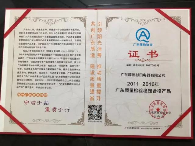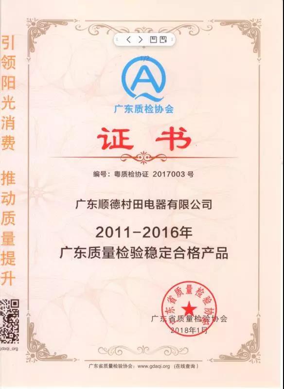 2018-04-29 15:58:52 点击量:945近日,在广东省质量检验协会组织开展的2011-2016年度质量调查汇总活动中,广东顺德九游(九游平台)一站式服务平台电器有限公司凭借卓越产品质量连续6次以上抽查合格,获得了由广东省质量检验协会颁发的“广东质量检验稳定合格产品”证书,可喜可贺!
